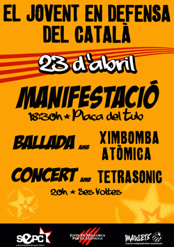 Així doncs, convocam a tothom el dia 23 d'abril a la manifestació El jovent en defensa del català que partirà a les 18.30 hores de la Plaça del Tub, a Palma fina a Ses Voltes, on després de llegir el manifest actuaràn els grups Ximbomba Atòmica i Tetrasònic.Vos hi esperam a tots i totes!