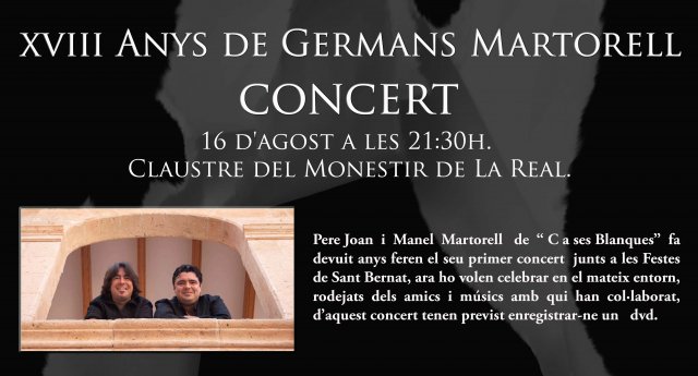 Devuit anys, ja és la majoria d'edat i els Germans Martorell, ho volem celebrar amb un concert rodejat dels amics i musics amb qui tots dos hem fet feina plegats. No podrem esser hi tots però així hi tot ens reunirem fins a 25 artistes damunt la tarima del Claustre del Monestir de la Real.